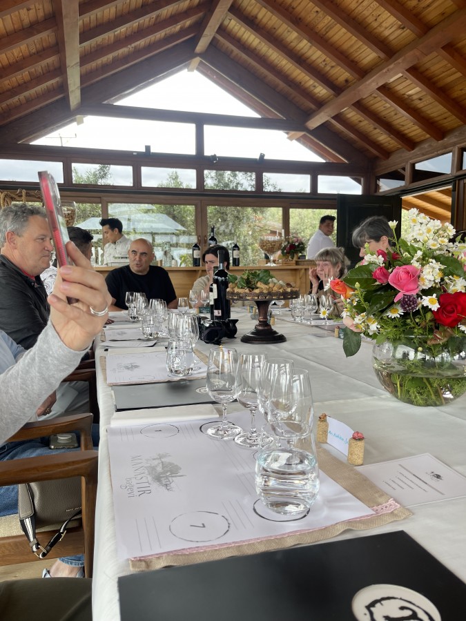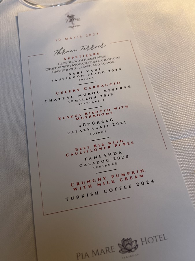 Exhausted after a long drive and two wineries, we stayed at a seaside resort preparing for the upcoming season, Pia Mare Hotel & Resort. I liked the bungalows spread along the sea and my enormous room with a view of the inner garden with the sea in the background through the trees. It reminded me a bit of Neptun and the villas there. The highlight of the evening was dinner, of course, prepared by a chef at the resort’s “Fume” restaurant, worthy of Michelin stars, a delight. We started with a welcome drink of Champagne to celebrate the event, followed by a perfect pairing with various wines. We began with Chateau Murou Semillon 2019, rounded with ripe fruits, a full body, and medium acidity paired with meze, crostini with avocado and shrimp, salmon, and labneh. Next was the 2021 Papaskarasi Buyulubag, a fresh red wine with high acidity, ripe, even dried fruits, figs, black cherries, raisins, and cranberries, a combination of red and black fruits paired with celery tartare, spinach, and parmesan with a lemon-based reduction. Karasi means black, so anything ending with this word yields red wines. The following Cabernet Sauvignon Sari Vadi, a very balanced wine with green pepper and black fruit aromas, ripe tannins, and serious persistence, had a happy pairing with mushroom risotto, a kind of couscous risotto, with which it matched perfectly. For the main course, the oven-roasted goat with cauliflower puree was sensational alongside Caledoc, a variety from southern France, a cross between Grenache and Malbec. A juicy, fruity, meaty wine with concentrated aromas, a velvety structure, and long-lasting persistence. The dessert of crunchy pumpkin with milk ice cream marked the beginning of the end of this Pantagruelian dinner, which we concluded with five-year-aged Horincă from Stefan Gogota’s Horincia, local Raki, and an international GT around the campfire on the terrace. A feast and a memorable party that made the morning not so clear. Setting off on a longer journey, we had time to recover before the next winery. We stopped somewhere in the mountains for tea and a breath of fresh air, and with renewed energy, we reached our next destination.