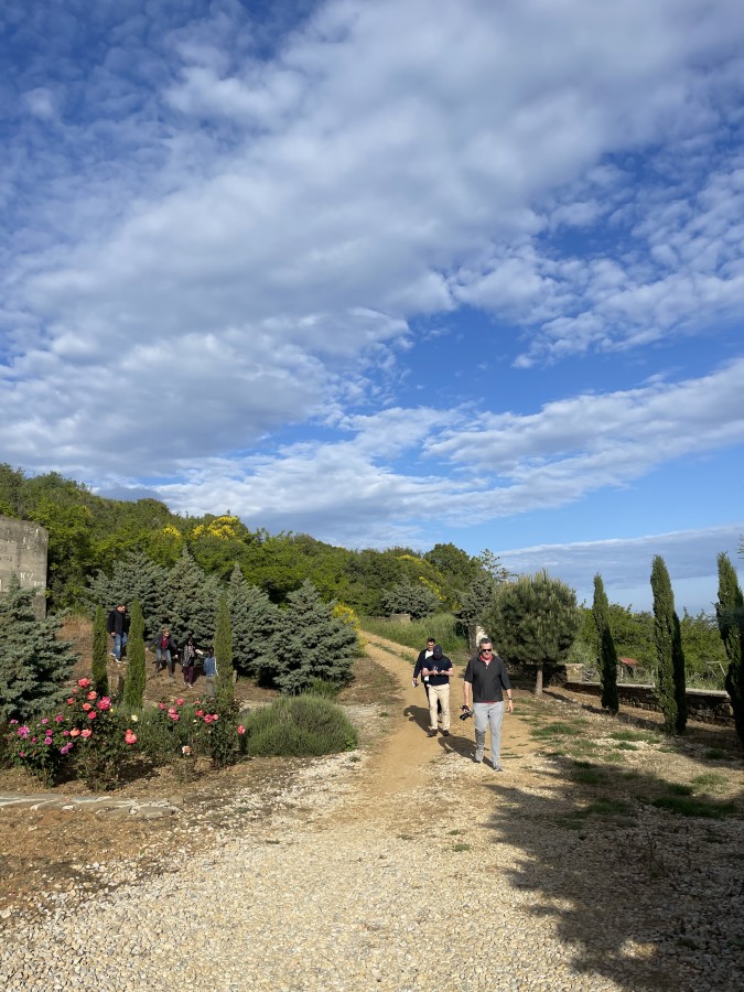 After the tasting and before lunch, we took a break to walk through the vineyard and the monastery courtyard to learn some interesting things. The monastery also functioned as a school in the area, having its own vineyard and garden, practically self-sufficient. We found bay trees, old Greek tiles, and traces of wild boar in the garden, a fairytale place worth visiting.