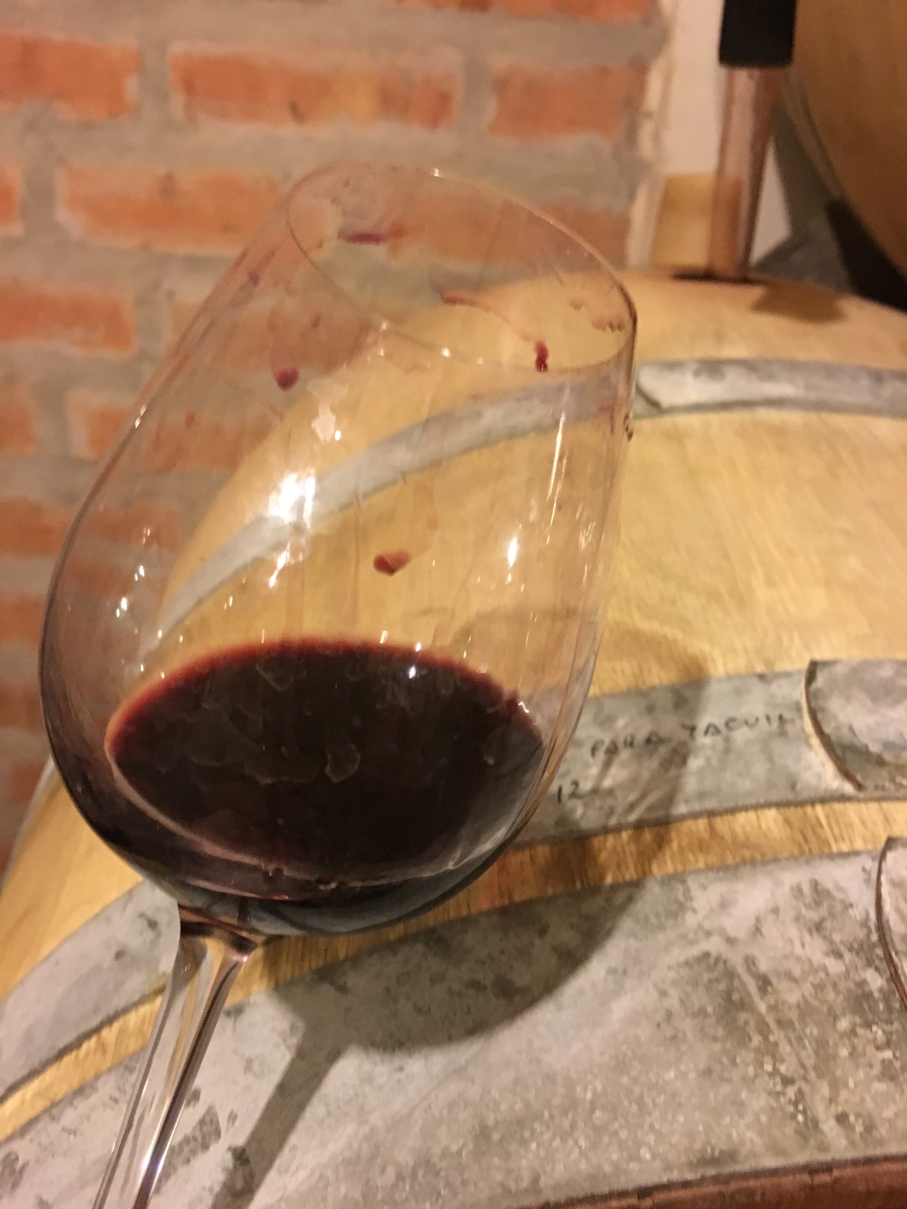 Din nou noroc și potriveală, pentru că era vremea culesului, așa că am fost printre primii lor degustători de vinuri din 2017! Erau două experimente de Malbec fermentat la butoi de stejar (baric), unul căruia i se făcuse tăierea în verde a frunzelor pentru ca strugurii să fie expuși la soare, unul fără această operațiune. Desigur, la primul s-au simțit fructele negre coapte, aciditatea mai mică și rotunjimea, al doilea era cu aciditate mai mare, mai viguros, puțin condimentat.