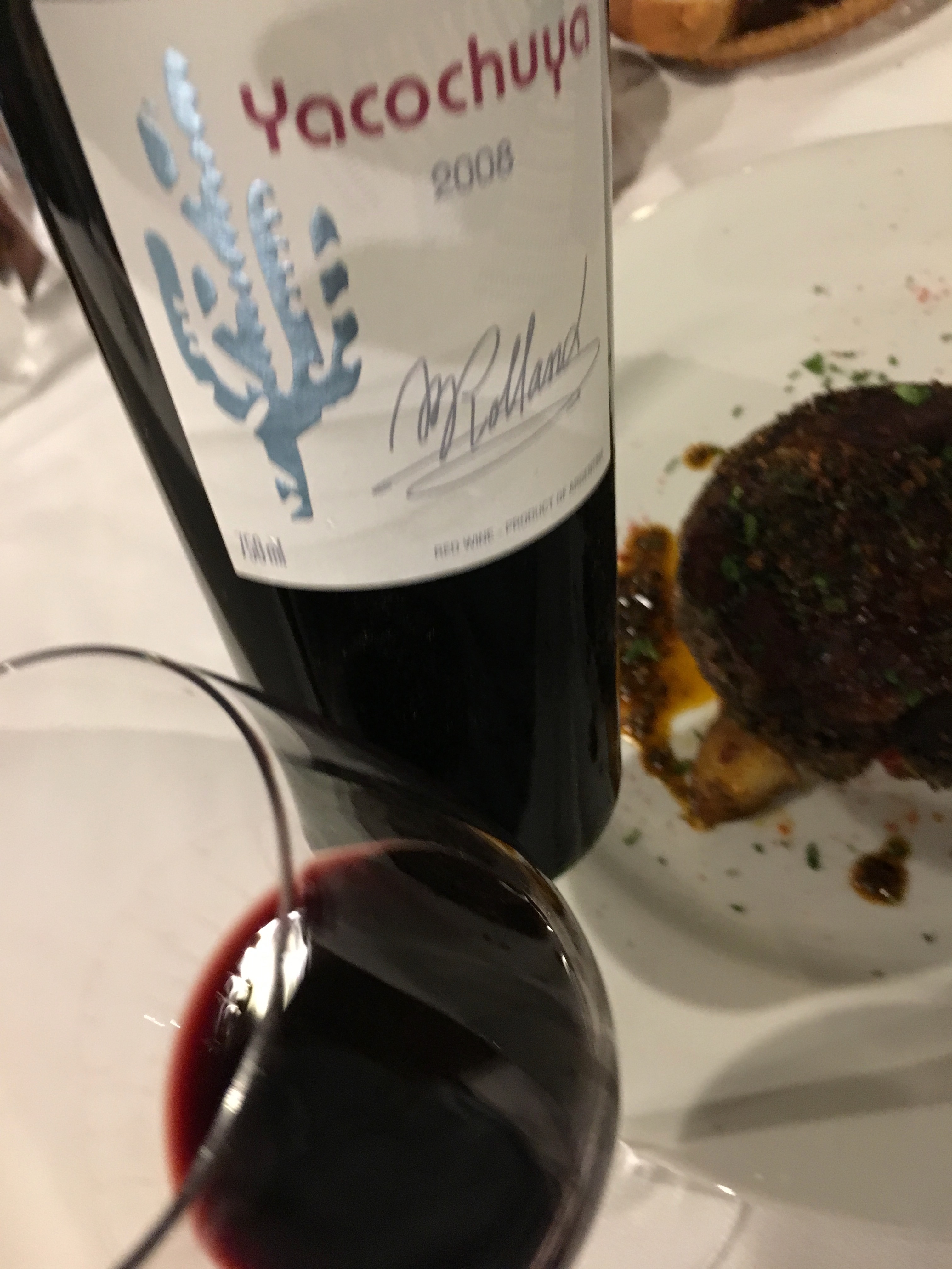 Am încheiat seara cu o tradițională vită argentiniană și cu un vin incredibil Yacochuya 2008. Atât de complex și de savuros, cu condimente, mai ales piper, cu piele și violete, cu taninuri ferme și cu corp plin, o intrare de neuitat in minunea de aventura argentiniana.